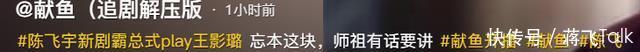 阅读此文之前,麻烦您点击一下“关注”,既方便您进行讨论和分享,又能给您带来不一样的参与感,创作不易,感谢您的支持。 没想到,由陈凯歌儿子陈飞宇主演的电视剧《献鱼》,播出之后竟然热度才这么一点。 虽然在站内的热度突破了6000,但是放在其他的电视剧面前,它被虐得简直渣渣都不剩。 《凡人修仙传》和《利剑玫瑰》都已经是大结局了很多天的电视剧了,但是新剧《献鱼》仍旧撼动不了它们分毫的地位,仅仅排在第五位。